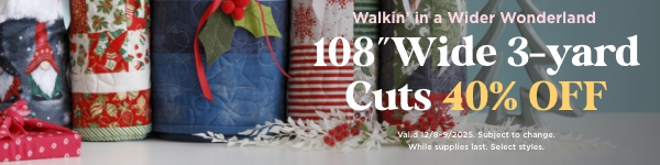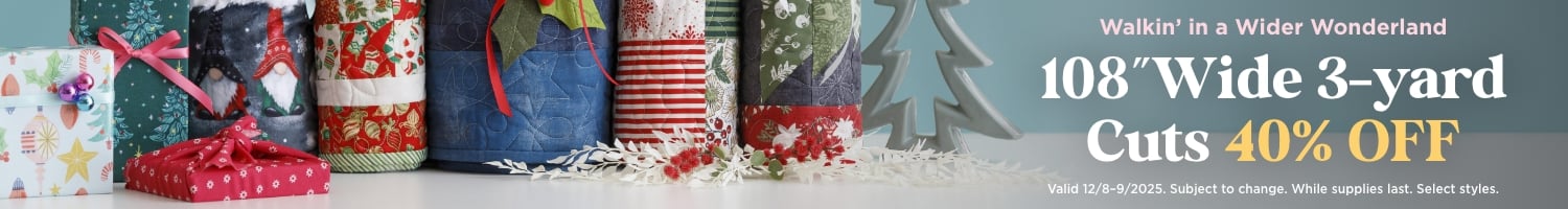 The front of your quilt is pieced; now you need the back! Get three-yard cuts of 108"-wide backing for 40% OFF. Just one piece is enough to back even your large quilts. You could slice up one of these cuts into smaller pieces, too! At more than double the width of normal quilting cotton, 108" widths give you a lot of bang for your fabric buck!