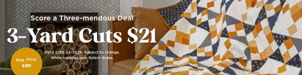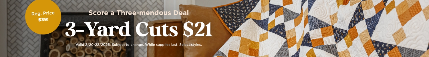 What will you do with three yards of fabric? You can save on whatever you decide to make, because three-yard cuts are just $21. Three yards are enough to back a baby quilt or a small throw. Add some complementary prints or solids from your stash, and you'll have the makings of a larger quilt. How about whipping up some throw pillows to freshen up your home décor? Make a couple totes, and share one with a friend. The possibilities are endless!