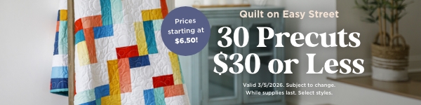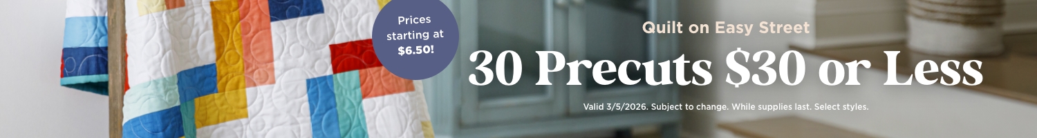 Precuts make quilting easy, and getting them on sale is easy on your wallet! We put together 30 precuts for you, each at $30 or less! Pick your favorite precuts–jelly rolls, charm packs, layer cakes, and fat quarters. They're convenient, they're coordinated, and they're on sale. Pick up a few today and get ready for quilting that's as easy as pie–or a layer cake!
