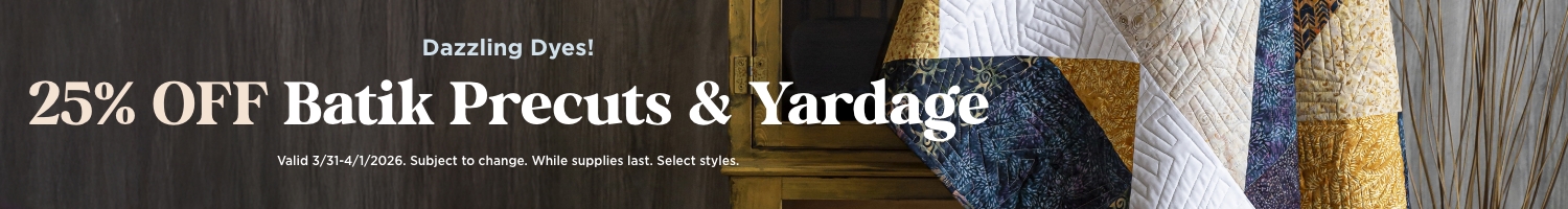 Immerse yourself in the vibrant colors and intricate designs of handmade batiks! For a limited time, enjoy 25% OFF a stunning selection of Batik precuts and yardage. From the rich textures of Lava Batik solids to beautiful floral and geometric prints, find everything you need to add a touch of artisanal elegance to your next project. Save on your favorites today! Valid 3/31/26 - 4/1/26. While supplies last, offer subject to change.