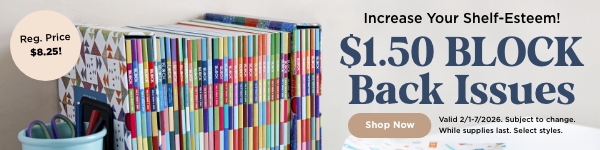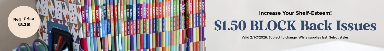 If your bookshelf has too much space, now's the time to fill it up. Select back issues of BLOCK are only $1.50 each! That's an incredible price for a full-color magazine that is stuffed with quilting tips, inspiration, and 10 patterns in every issue. That's right, each and every issue contains 10 complete patterns, from large quilts to quick and easy mini projects. Grab these back issues of BLOCK while you can!
