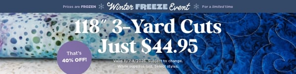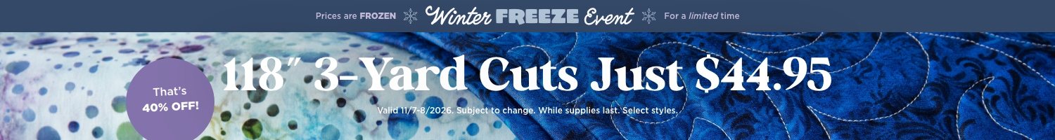 When winter settles in, it’s the perfect time to think big. During our Winter Freeze sale, we’re serving up serious value on 118" extra-wide fabric—pre-cut into convenient 3-yard pieces and priced to keep your stash warm! At just $44.95, these wide cuts are ideal for quilt backs, oversized projects, and anything that calls for fewer seams and more coverage. No measuring. No guesswork. Just grab, sew, and stay cozy at your machine! This deal is only here for a quick cold snap—so don’t let these fabrics slip away!