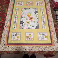 Make a bee-utiful quilt for the littlest one in your brood. This adorable quilt kit features a center panel with smiling honey bees buzzing about surrounded by blooming flowers.
