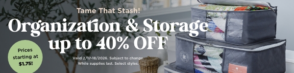 Tidy up your sewing space and save up to 40%! From pattern binders and project cases to storage bags and thread organizers, our select organization and storage solutions are now on sale. Clear the clutter and spend more time creating—shop now for high-quality ways to keep your quilting life in order! Valid: Feb 17 – 18, 2026. No rainchecks. Exclusions apply.
