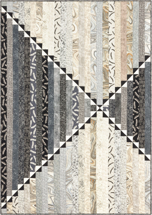 Get ready to transform your quilting journey with the mesmerizing Center Point quilt, a contemporary design that turns fabric into a breathtaking work of art! Measuring a generous 50" x 70", this Robert Kaufman pattern showcases the elegant "Chalk and Charcoal" fabric collection, creating a sophisticated dance of light and dark that will captivate both novice and experienced quilters. The quilt's unique design features an intricate geometric layout that creates a dynamic visual journey across the surface, with strips of varying lengths forming a striking diagonal pattern that seems to pulse with movement and energy.