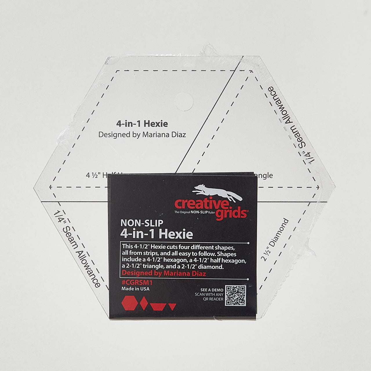 We know you'll be tempted by this new 4-in-1 Hexie template! With easy-to-read markings and a non-slip surface, this 4 1/2" Hexie cuts four different shapes, all from strips! Shapes include a 4 1/2" hexagon, 4 1/2" half-hexagon, 2 1/2" triangle, and 2 1/2" diamond. This ruler design cleverly eliminates the dog ears and comes with fully illustrated step-by-step instructions.