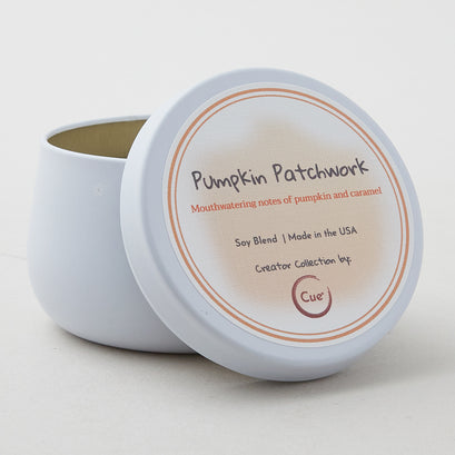 Celebrate autumn with mouthwatering notes of pumpkin and caramel in Pumpkin Patchwork, a Creator Collection candle by Cue. The scents of freshly brewed coffee and frothed milk come together with whipped pumpkin and spiced caramel. The soy wax blend, 20-hour candle with patented OpenWick technology provides a long burn time with minimal soot to deliver more fragrance throughout your home. Comes in a covered metal tin.