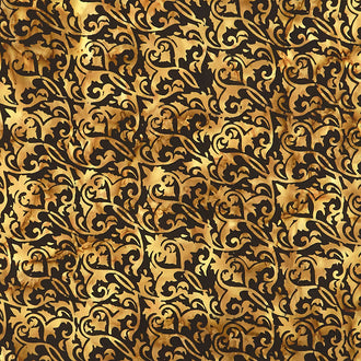 Gold heart-shaped vines intertwine on a black batik. Sew a royal masterpiece with the King’s Castle collection for Island Batik! With handsome batiks in gold and black, this collection’s opulence will have you dreaming up sophisticated projects. Featuring swirls and symbols of royalty, these fabrics are stunning on their own and especially when paired together.