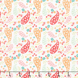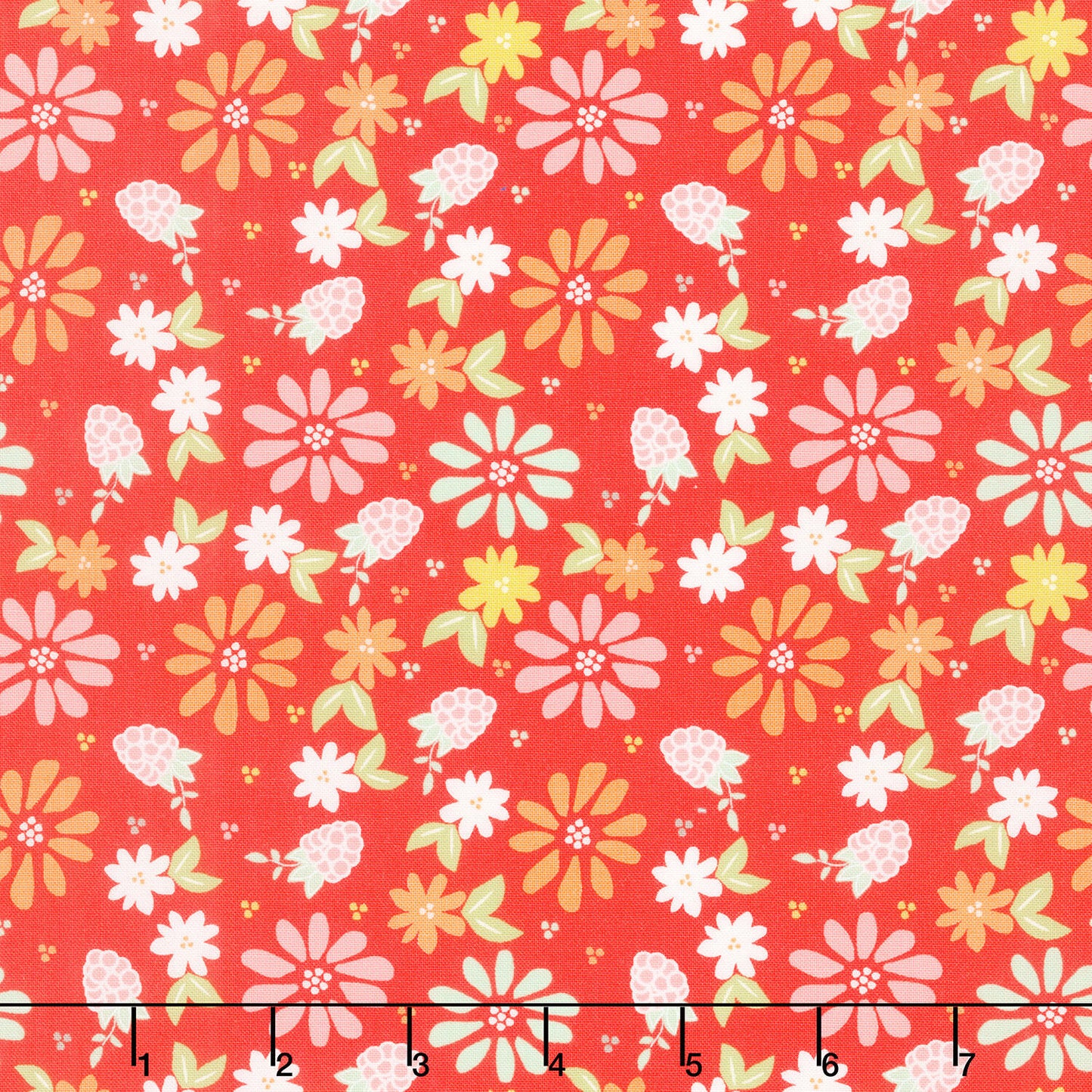 Pink, orange, and white flowers and raspberries tossed atop a red background. Jump into some fun with Raspberry Summer! Designed by Sherri & Chelsi for Moda, this flower-forward collection features fabrics in every color of the rainbow with vibrant blooms, gingham, and more. Create something spectacular with these pretties!