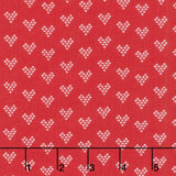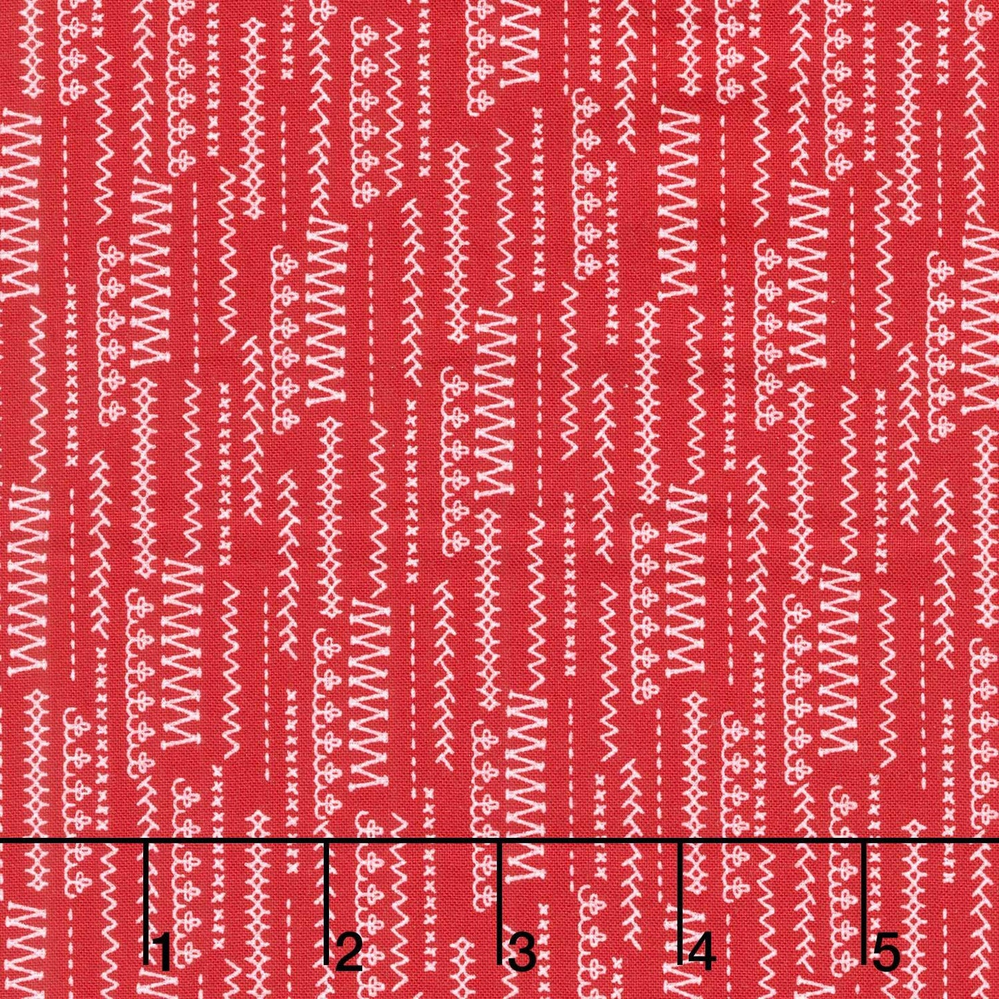 Pink stitches on a red background. If you love sewing, you'll love Threads! This charming fabric by Sweetwater for Moda Fabrics takes all the crafty things you can do with thread and stitches them together in one adorable collection. With prints of cross-stitched hearts, quilt blocks, buttons, notions, and more, this fabric would be great for totes, sewing room accessories, and quilts for sewists!